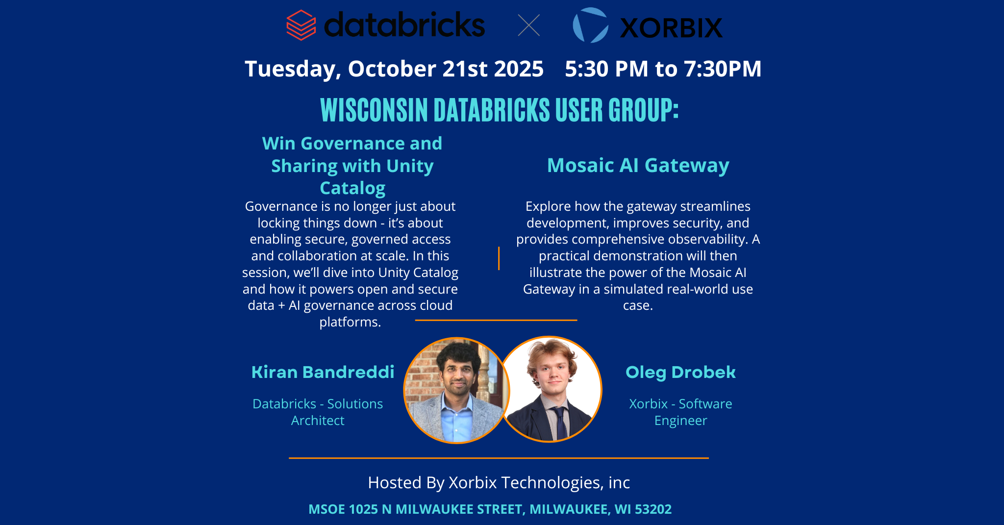 Suite 108 1225 Discovery Pkwy, Wauwatosa, WI, United StatesNO COST MEETING EVENT Food and refreshments will be provided Featured Speakers: Asif Bakar – Founder CEO of Xorbix Technologies Ryan Shiva – Software Engineer Tyler Faulkner – Software Engineer This workshop is designed to collaborate, educate, and connect with Databricks professionals and enthusiasts. Join local leading Databricks experts and explore how data intelligence enables […]